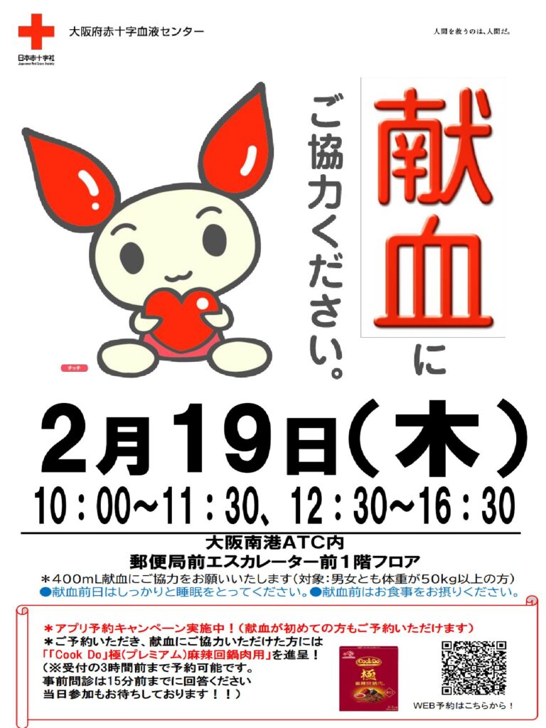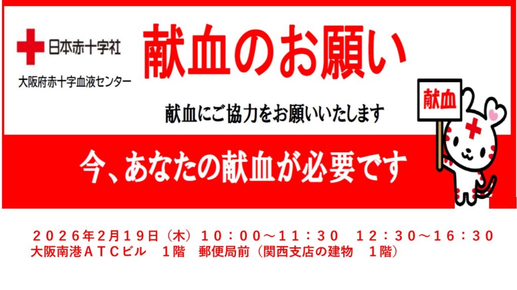 2026年冬季献血(ATCビル)の実施について 日本赤十字社より献血の要請がありましたので、ご協力をお願い致します。万全の感染防止対策を講じた上での実施としますので、大変ご多忙とは存じますが、献血活動の取組みへのご理解・ …